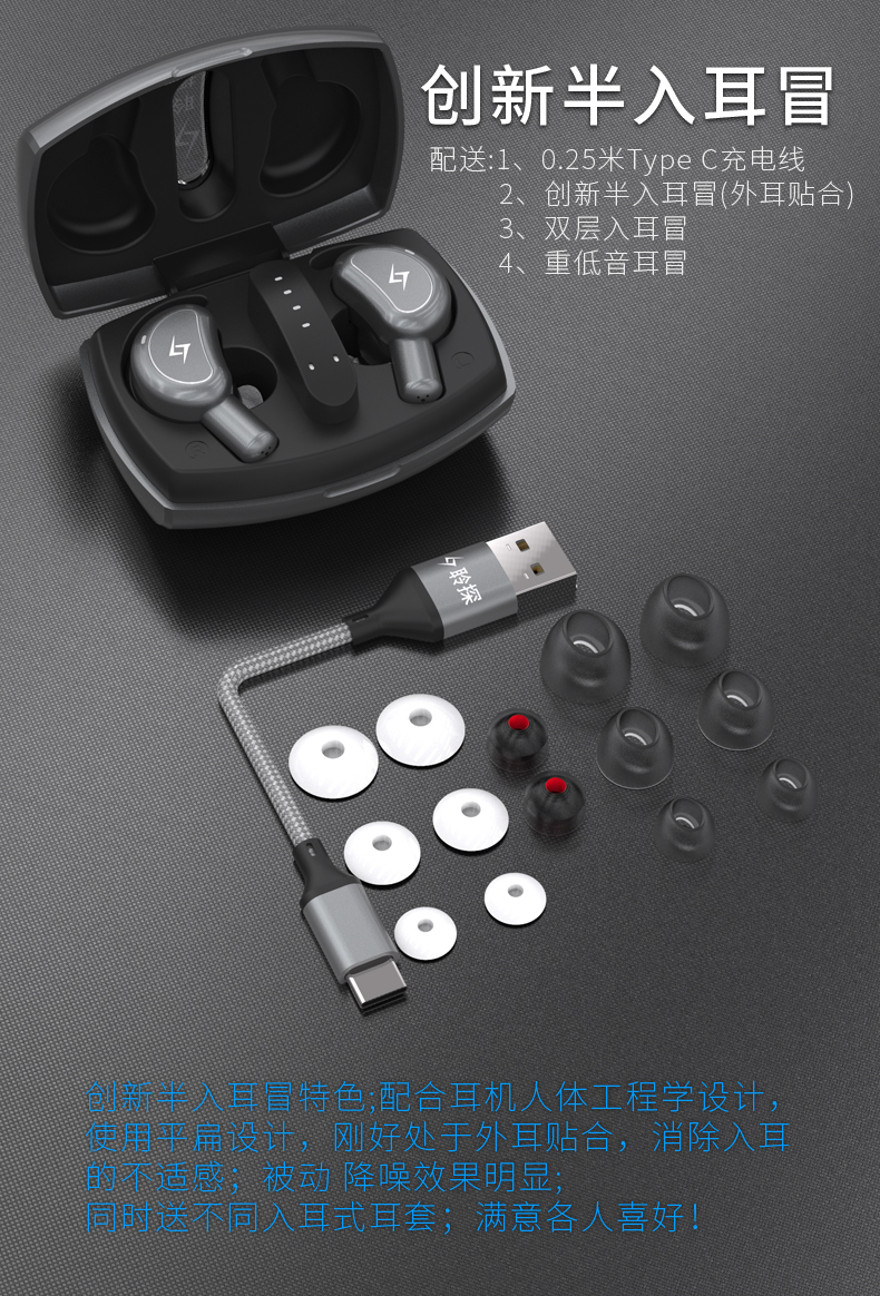 7、創新半入耳套,并送重低音耳冒和雙層耳冒,共7對;
