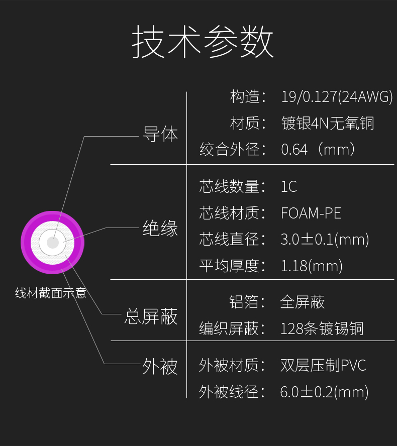 1、19條鍍銀單線,128條鍍錫銅+鋁箔屏蔽;
