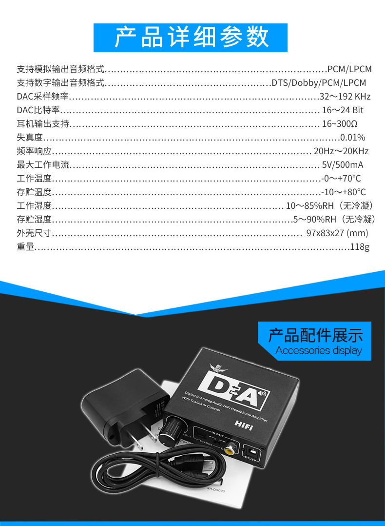 這款音頻轉換器可以把SPDIF信號(光纖+同軸)信號輸出到光纖+同軸信號輸出,同時將LPCM格式的數字音頻轉換成立體聲模擬音頻輸出。